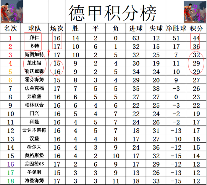 积分榜方面,多特先赛大胜后,暂时将和拜仁的分差缩小回个位数,落后拜仁8分,坐稳了第2的位置。斯图加特冬歇期回来后状态不错,今天拿下法兰克福后夺得连胜,近4轮3胜1平保持不败,只能是超过莱比锡和勒沃库森冲进前3。
