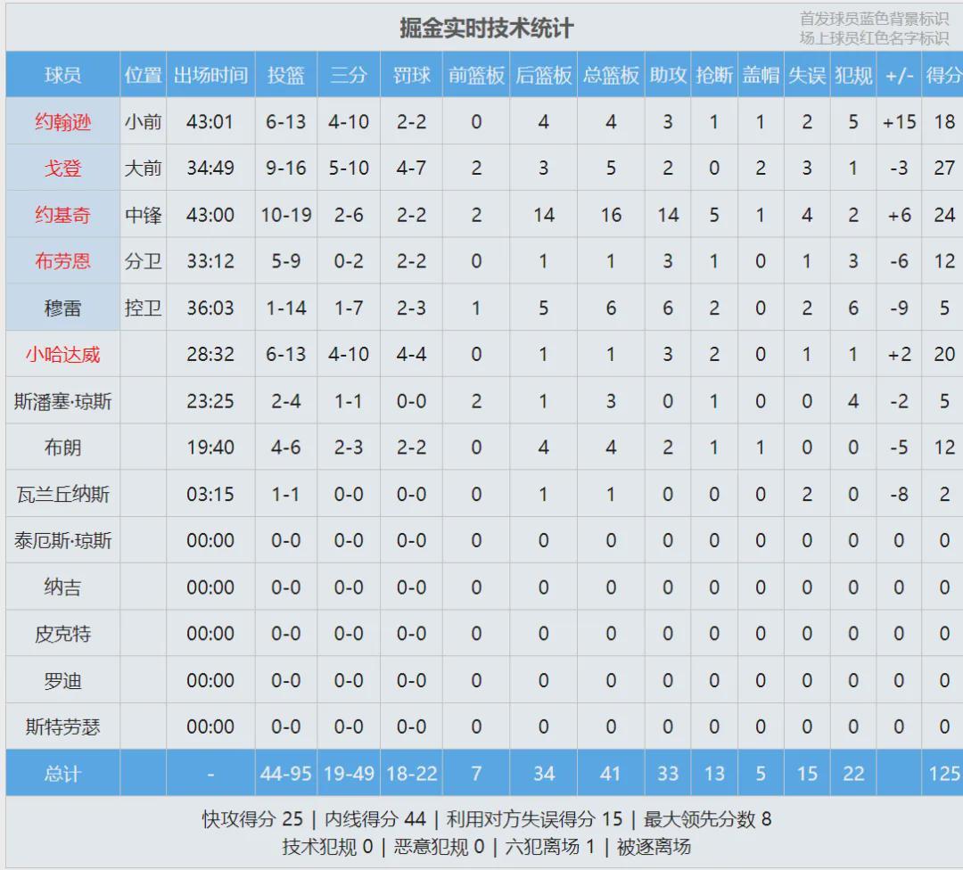 本赛季湖人和掘金交手3次,湖人2胜1负。最后看看数据: